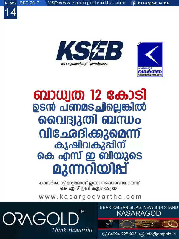 Keywords: Kasaragod, Kerala, news, Agriculture, 12 crore Liability; KSEB's Warning to Agricultural department