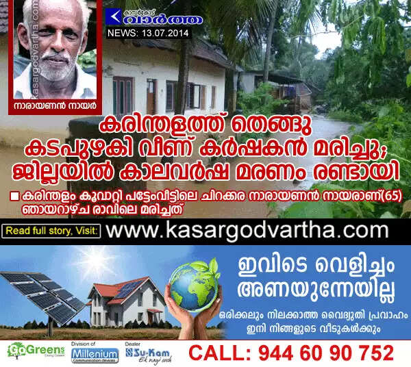 കരിന്തളത്ത് തെങ്ങു കടപുഴകി വീണ് കര്ഷകന് മരിച്ചു; ജില്ലയില് കാലവര്ഷ മരണം രണ്ടായി