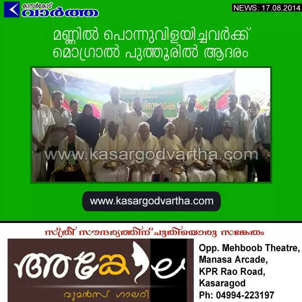 മൊഗ്രാല് പുത്തൂര്: (www.kasargodvartha.com 17.08.2014) പതിറ്റാണ്ടുകളായി കൃഷിക്കായി മനസ്സും ശരീരവും സമര്പ്പിച്ച മൊഗ്രാല് പുത്തൂരിലെ പാരമ്പര്യ കര്ഷകരെ പൊന്നാട അണിയിച്ച് ആദരിച്ചു. മൊഗ്രാല് പുത്തൂര് കൃഷി ഭവനില് നടന്ന കര്ഷക ദിനാഘോഷം നൂറുകണക്കിന് കര്ഷകരുടെ സാന്നിധ്യം കൊണ്ട് നാടിന് ഉത്സവമായി.