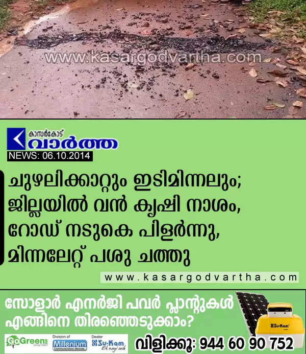 ചുഴലിക്കാറ്റും ഇടിമിന്നലും; ജില്ലയില് വന് കൃഷി നാശം, റോഡ് നടുകെ പിളര്ന്നു, മിന്നലേറ്റ് പശു ചത്തു