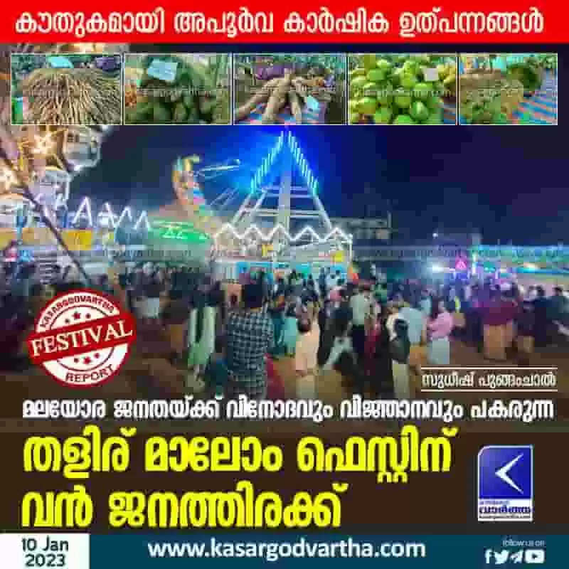 വെള്ളരിക്കുണ്ട്: (www.kasargodvartha.com) മാലോം മഹാത്മാഗാന്ധി ചാരിറ്റബിള്‍ ട്രസ്റ്റ് ആഥിത്യമരുളുന്ന ഉത്തരമലബാര്‍ കാര്‍ഷിക മഹോത്സവം തളിര് 2023 മാലോം ഫെസ്റ്റിന് ജനത്തിരക്കേറി. ഈ മാസം 15 വരെ നീണ്ടുനില്‍ക്കുന്ന വിനോദ മാമാങ്കത്തിലേക്ക് മലയോരത്തിന് പുറത്തുനിന്നും ജനങ്ങള്‍ ഒഴുകിയെത്തുകയാണ്.