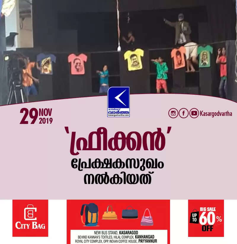 (www.kasargodvartha.com 29.11.2019) സംസ്ഥാന സ്‌കൂള്‍ കലോത്സവത്തില്‍ ഇന്നലെ നടന്ന 'ഫ്രീക്കന്‍' നാടകം എല്ലാ ആസ്വാദകര്‍ക്കും ഒരേ വാര്‍പ്പില്‍ തീര്‍ത്ത സന്ദേശമായിരിക്കില്ല നല്‍കിയിരിക്കുക. അങ്ങിനെ ഒരാസ്വാദനം നല്‍കുന്നതും ശരിയല്ലല്ലോ. അരങ്ങൊരുക്കിയ കലാവിരുത് മുതല്‍ ഫ്രീക്കന്‍ കാഴ്ചാനുഭവം നല്‍കിത്തുടങ്ങി. ഏറ്റവും ചടുലമായി അവതരിപ്പിക്കേണ്ട കുട്ടി തന്നെ മുഖ്യകഥാപാത്രമായി പ്രേക്ഷകരുടെ മനവും കവര്‍ന്നു.