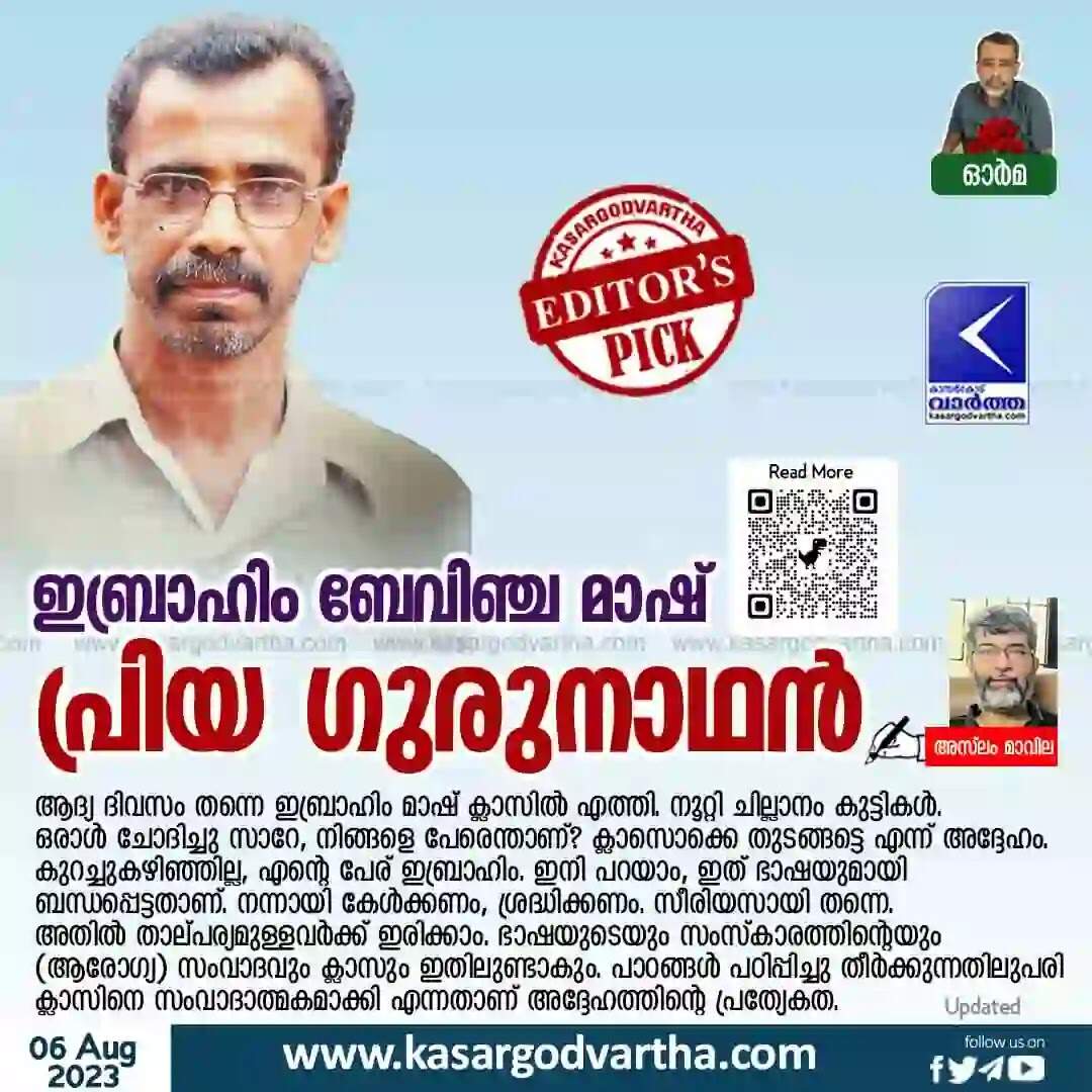 Keywords: Ibrahim Bevinje, Malayalam literature, Kasaragod Govt. College, ONV Kurupp, Article, Aslam Mavila, Ibrahim Bevinje, Favourite teacher.
