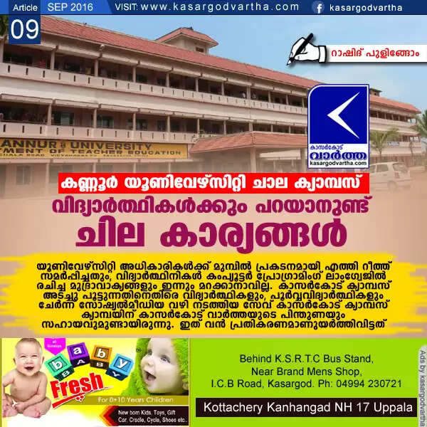 Keywords: Article, Kannur University, Students, College, Vidya Nagar, kasaragod, Chala Campus, Issues, Hostel inauguration, Education minister, Social Media.
