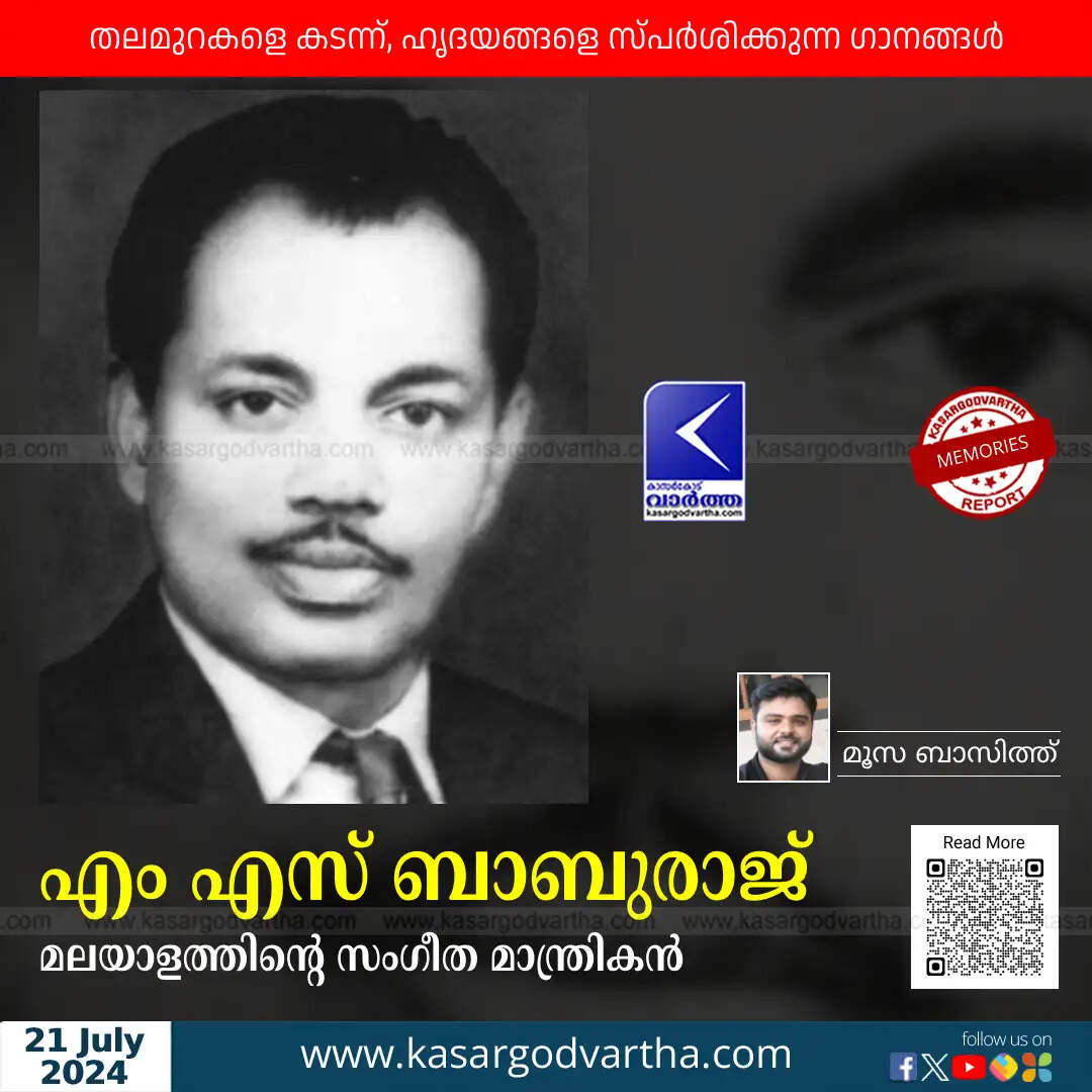 (KasargodVartha) വർഷങ്ങൾക്ക് മുൻപാണ്. ബസ് കണ്ടക്ടർ സിനിമയിൽ മമ്മൂട്ടിയുടെ കഥാപത്രം ഹാർമോണിയ പെട്ടിയുമായി പാടുന്നു, 'പ്രാണ സഖി ഞാൻ വെറുമൊരു പാട്ടുകാരൻ'. കേൾക്കാൻ ഇമ്പമുള്ള, വീണ്ടും വീണ്ടും കേൾക്കാൻ തോന്നുന്ന ആ ഗാനത്തിന്റെ ആദ്യ വരികളോട് അന്ന് വല്ലാത്തൊരു ഇഷ്ടം തോന്നി. സെർച്ച് ചെയ്യാൻ ഗൂഗിളോ, വീണ്ടും കേൾക്കാൻ യൂട്യൂബോ സജീവമല്ലാത്ത കാലം. വെള്ളിനക്ഷത്രം വാരികയിലെ ഫാൻ മെയിൽ പേജായിരുന്നു അന്ന് എനിക്ക് ഉത്തരം നൽകിയിരുന്ന ഗൂഗിൾ. അമ്പത് പൈസയുടെ മഞ്ഞ കാർഡിൽ തിരുവനന്തപുരത്തേ വാരികയുടെ ഓഫിസിലേക്ക് കത്തയക്കും. പ്രാണ സഖി ചോദ്യത്തിന് അന്ന് എനിക്ക് ലഭിച്ച ഉത്തരമാണ് എം എസ് ബാബുരാജ്.