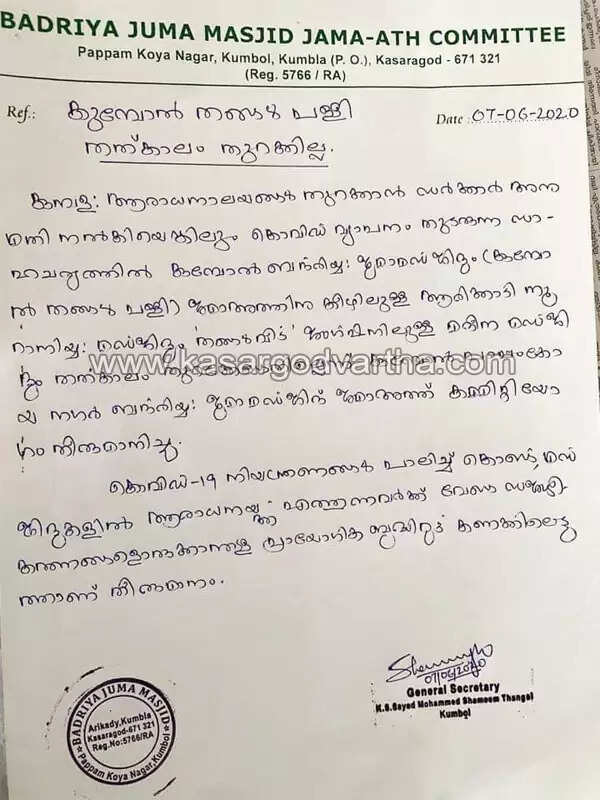 നഗര കേന്ദ്രീകൃതം അല്ലാതിരുന്നിട്ടും അംഗടിമുഗര് ജുമാമസ്ജിദിലും ബേക്കൽ മവ്വൽ ജുമാ മസ്ജിദിലും കുമ്പോൽ പാപം കോയ തങ്ങൾ നഗറിലെ ബദ് രിയ ജുമാ മസ്ജിദും തുടങ്ങി നിരവധി പള്ളികളിൽ കൊവിഡ് പശ്ചാത്തലത്തില് ജുമുഅഃ ഇനി അറിയിപ്പ് ഉണ്ടാവുന്നതുവരെ നടത്തേണ്ടെന്നാണ് തീരുമാനം.