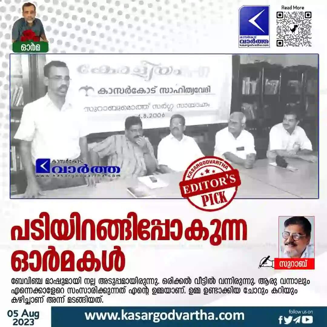 ഇത്രയും ഓര്‍മ്മിപ്പിച്ചത് കെ വാര്‍ത്തയിലെ മുജീബ് അയച്ചു തന്ന ഈ ഫോട്ടോയാണ്. കഴിഞ്ഞ ദിവസം ഇബ്രാഹിം ബേവിഞ്ചയും ഓര്‍മ്മയായി. ബേവിഞ്ച മാഷുമായി നല്ല അടുപ്പമായിരുന്നു. ഒരിക്കല്‍ വീട്ടില്‍ വന്നിരുന്നു. ആരു വന്നാലും എന്നെക്കാളേറെ സംസാരിക്കുന്നത് എന്റെ ഉമ്മയാണ്. ഉമ്മ ഉണ്ടാക്കിയ ചോറും കറിയും കഴിച്ചാണ് അന്ന് മടങ്ങിയത്. ആയിടെ ഒരു കവിതാ സമാഹാരത്തിന്റെ പണിപ്പുരയിലായിരുന്നു ഞാന്‍. പിന്നീട് ഒലിവ് ബുക്‌സ് പ്രസിദ്ധീകരിച്ച ' അവിടെ മഴ പെയ്യാറില്ല ' എന്ന സമാഹാരം. അതിന് കെ പി മോഹനന്‍ മാഷ് ഒരു അവതാരിക എഴുതിത്തന്നിരുന്നു. ബേവിഞ്ച മാഷിന്റെ പഠനംകൂടി വേണം. രണ്ടും ഒന്നിച്ചു തരാമെന്നു പറഞ്ഞു മോഹനന്‍ മാഷിന്റെ അവതാരികയും വാങ്ങി യാത്രയായി. യാത്രയില്‍ മാഷ്‌ക്ക് അവതാരിക നഷ്ടപ്പെട്ടു. അന്ന് ഫോട്ടോകോപ്പി എടുത്തുവെയ്ക്കുന്ന ശീലമൊന്നുമില്ലല്ലോ.