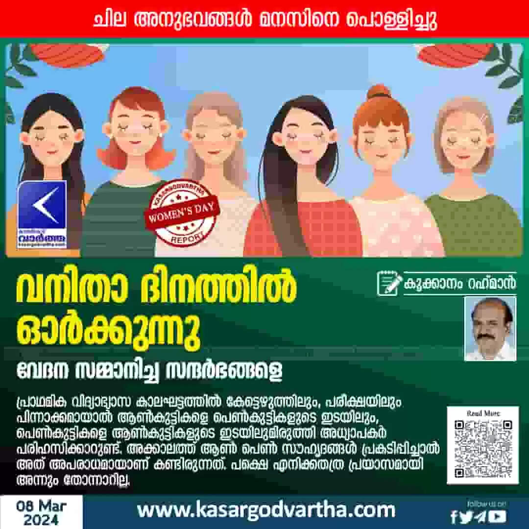 (KasargodVartha) സഹോദരിമാരില്ലാത്ത കാരണം കൊണ്ട് എനിക്ക് പണ്ടേ പെണ്‍കുട്ടികളെയും, സ്ത്രീകളേയും നല്ല ഇഷ്ടമായിരുന്നു. ആ കാരണം കൊണ്ട് തന്നെ അവരുടെ സന്തോഷ സന്താപങ്ങള്‍ കേട്ടറിയാനും കഴിയാവുന്നത്ര പരിഹാരം കാണാനും ഞാൻ പരമാവധി ശ്രമിക്കാറുണ്ട്. പ്രാഥമിക വിദ്യാഭ്യാസ കാലഘട്ടത്തില്‍ കേട്ടെഴുത്തിലും, പരീക്ഷയിലും പിന്നോക്കമായാല്‍ ആണ്‍കുട്ടികളെ പെണ്‍കുട്ടികളുടെ ഇടയിലും പെണ്‍കുട്ടികളെ ആണ്‍കുട്ടികളുടെ ഇടയിലുമിരുത്തി അധ്യാപകര്‍ പരിഹസിക്കാറുണ്ട്.