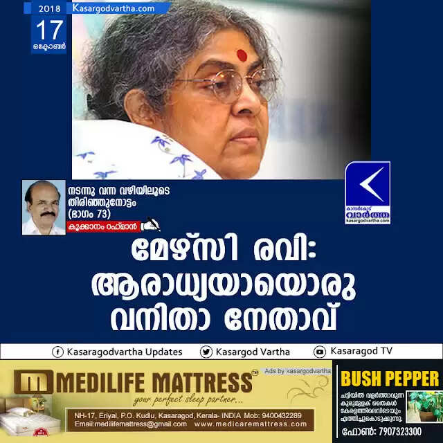 (www.kasargodvartha.com 17.10.2018) സാമൂഹ്യ-സാംസാകാരിക-രാഷ്ട്രീയ രംഗത്ത് പ്രവര്ത്തിച്ചു വരുന്ന നിരവധി വനിതാ പ്രവര്ത്തകരുമായി ഇടപഴകി പ്രവര്ത്തിക്കേണ്ടി വന്ന അവസരങ്ങള് എനിക്കുണ്ടായിട്ടുണ്ട്. നന്മകളുടെ വിളനിലമായ വനിതാ പ്രവര്ത്തകരെയും താന്പോരിമയും താന് പ്രമാണിത്തവും മുഖമുദ്രയാക്കിയ വനിതാ പ്രവര്ത്തകരെയും ഇക്കാലയളവില് കണ്ടു മുട്ടിയിട്ടുണ്ട്. സമൂഹത്തിലെ വിവിധ മേഖലകളില് പ്രവര്ത്തിച്ചു വരുന്നവര്ക്കും ഇനിയും ഇത്തരം പ്രവര്ത്തനങ്ങളില് വരാന് താല്പ്പര്യമുള്ളവര്ക്കും അനുകരിക്കാന് പറ്റുന്ന മേഴ്സി രവിയെക്കുറിച്ച് ഒരുപാട് കേട്ടറിഞ്ഞിട്ടുണ്ടെങ്കിലും അവരെ നേരിട്ടു കാണുന്നതും ഒരു വേദിയില് ഒപ്പം ഇടപഴകാന് സാധിച്ചതും പത്തുവര്ഷങ്ങള്ക്കു മുമ്പ് മാത്രമാണ്.