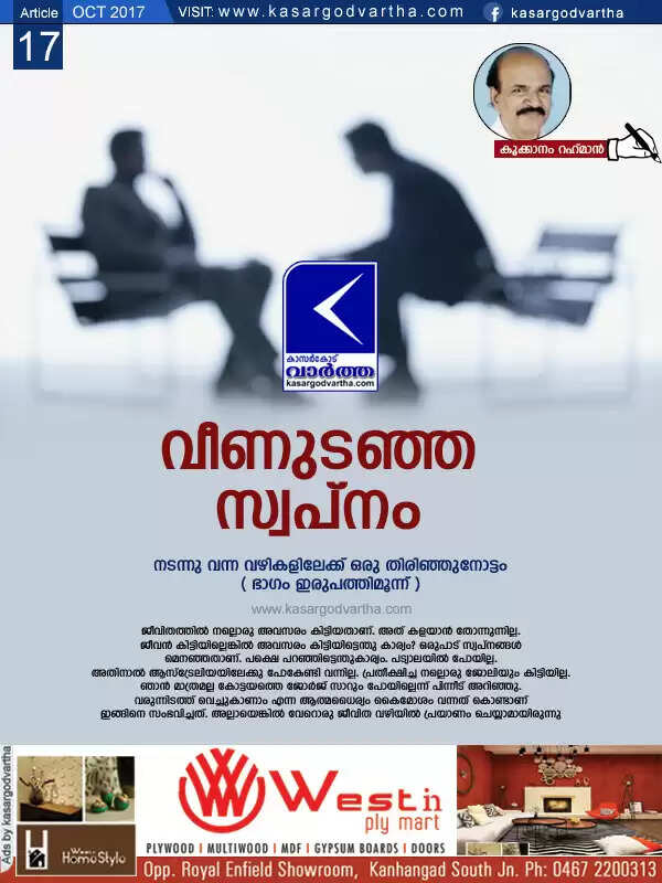 (www.kasargodvartha.com 17.10.2017) ജീവിതത്തില് സംഭവിക്കുന്ന ചില കാര്യങ്ങള് വിചാരിക്കാതെ വന്നുപെടുന്നതാണ്. അതില് യാഥാര്ത്ഥ്യമാവുന്നതും നിരാശപ്പെടുത്തുന്നതും സന്തോഷ- സന്താപങ്ങള്ക്ക് ഇടവരുത്തുന്നതുമൊക്കെയുണ്ടാവാം. മിക്കവരുടെയും ജീവിതത്തില് സംഭവിക്കുന്ന വിജയപരാജയങ്ങള് മുന്ധാരണയിലൂടെയോ, മുന് വിധിയിലൂടെയോ ഉണ്ടാകുന്നതല്ല. കയ്യെത്തും ദൂരത്ത് എത്തിപ്പെട്ട നേട്ടങ്ങള് അകന്നകന്ന് പോവുമ്പോള് മനസ്സ് നൊമ്പരപ്പെടും. അത്തരമൊരനുഭവം എനിക്കുണ്ടായി.