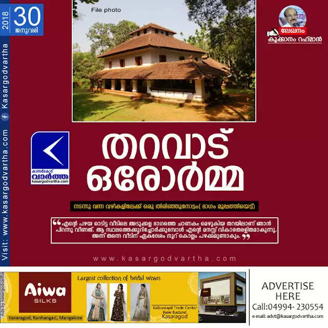 (www.kasargodvartha.com 30.01.2018) ജനിച്ചുവീണ വീടും കളിച്ചുനടന്ന മണ്ണും മനസ്സില്‍ വേരു പിടിച്ചു നില്‍ക്കുന്ന ഓര്‍മ്മകളാണേവര്‍ക്കും. എന്റെ ബാല്യവും, കൗമാരവും, യൗവ്വനവും തറവാട് വീട് നിന്നിരുന്ന കൂക്കാനം പ്രദേശത്തായിരുന്നു. അവിടം വിട്ട് സ്വന്തം പണിത വീട്ടില്‍ താമസം തുടങ്ങിയിട്ട് മൂന്നു പതിറ്റാണ്ട് പിന്നിട്ടു. എങ്കിലും സ്വപ്നത്തിലെന്നും പഴയ തറവാട് വീടും പരിസരവും മാത്രമെ വരൂ. ആ പറമ്പിലെ ഓരോ മരവും, മണ്‍ കയ്യാലകളും, വീട്ടിലേക്ക് കടന്നു വരാനുളള ഗേറ്റും എല്ലാം ഓര്‍മ്മയിലുണ്ട്. അവയൊക്കെ നശിക്കുകയോ നശിപ്പിക്കുകയോ ചെയ്തു. എങ്കിലും അവ നില കൊണ്ട സ്ഥലവും അവയുടെ രൂപവും മനസ്സില്‍ തങ്ങി നില്‍ക്കുന്നു. വീടും അത് നിന്ന സ്ഥലവും ഇന്ന് ആരുടെയോ കൈയിലാണ്. പഴയ തറവാടു വീടിന്റെ സ്ഥാനത്ത് ഇന്നവിടെ കൊട്ടാരസദൃശമായ ഇരുനില കെട്ടിടമുയര്‍ന്നു നില്‍ക്കുന്നു.