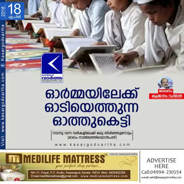 (www.kasargodvartha.com 18.04.2018) മനതാരില്‍ പൂത്തുനില്‍ക്കുന്ന ഓര്‍മ്മകള്‍ മധുരമുളളതും കൈപ്പുളളതും ആവാം. ഓര്‍മ്മകളെപ്പോഴും സുഖദായകമാണ്. പ്രത്യേകിച്ച് കുഞ്ഞുന്നാളിലെ മൃദുല മനസ്സില്‍ കൊത്തിവെച്ച മനോഹരിതമായ അനുഭവങ്ങളും, നീറ്റലുളവാക്കുന്ന പൊളളുന്ന ഓര്‍മ്മകളും അയവിറക്കാന്‍ കൗതുകം തോന്നും. ആറ്-ഏഴ് വയസ്സിലെ പഠനോര്‍മ്മകള്‍ പഴയകാലത്തെ ആളുകളില്‍ എന്നും മുഴച്ചു നില്‍ക്കും. പക്ഷേ അത്തരം കാര്യങ്ങള്‍ അയവിറക്കുന്നത് പറഞ്ഞ് കേള്‍ക്കാന്‍ പോലും പുതുതലമുറ ഇഷ്ടപ്പെടുന്നില്ല. അറുപത് വയസ്സ് കഴിഞ്ഞ പല ആളുകളും നടന്ന് വന്നത് കല്ലും മുളളും നിറഞ്ഞ പാതകള്‍ പിന്നിട്ടാണ്. പഴയ തലമുറ അനുഭവിച്ചറിഞ്ഞ വേദനകള്‍ സുഖലോലുപതയില്‍ കഴിയുന്ന ഇന്നത്തെ യുവതലമുറയ്ക്ക് ചിന്തിക്കാന്‍ പോലും കഴിയുന്നില്ല. അന്ധവിശ്വാസവും അനാചാരങ്ങളും കൊടികുത്തി വാണിരുന്ന കാലത്ത് ജീവിച്ചുവന്നവര്‍ അനുഭവിച്ച പ്രയാസങ്ങള്‍ വിവരണാതീതമാണ്. 'തിരുവായ്ക്ക് എതിര്‍വായില്ല' എന്ന് പറഞ്ഞപോലെ രക്ഷിതാക്കളും, ഗുരുനാഥന്മാരും, ഉസ്താദുമാരും പറയുന്നത് അംഗീകരിക്കുക എന്ന് മാത്രമേ ഞങ്ങള്‍ക്ക് ചെയ്യാന്‍ പറ്റുമായിരുന്നുളളൂ. ചോദ്യം ചെയ്യലില്ല, സംശയ നിവാരണത്തിന് സാധ്യതയില്ല. വയറ് നിറച്ചുണ്ണാന്‍ ഗതിയില്ലാത്ത കാലം. ഉടുതുണിക്ക് മറുതുണിയില്ലാത്ത കാലം.