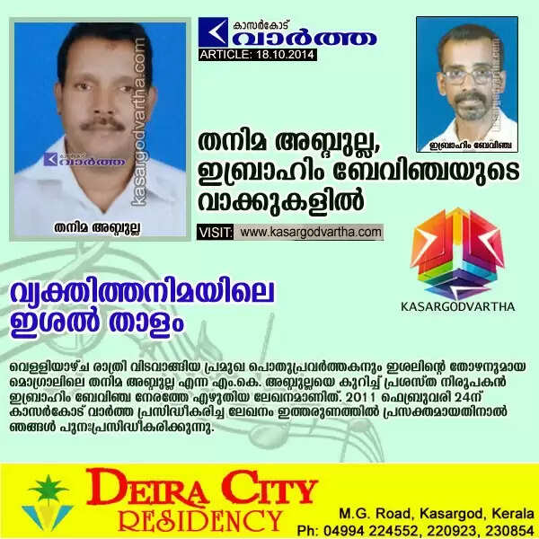 (www.kasargodvartha.com 18.10.2014) വെള്ളിയാഴ്ച രാത്രി വിടവാങ്ങിയ പ്രമുഖ പൊതുപ്രവര്ത്തകനും ഇശലിന്റെ തോഴനുമായ മൊഗ്രാലിലെ തനിമ അബ്ദുല്ല എന്ന എം.കെ. അബ്ദുല്ലയെ കുറിച്ച് പ്രശസ്ത നിരൂപകന് ഇബ്രാഹിം ബേവിഞ്ച നേരത്തേ എഴുതിയ ലേഖനമാണിത്. 2011 ഫെബ്രുവരി 24ന് കാസര്കോട് വാര്ത്ത പ്രസിദ്ധീകരിച്ച ലേഖനം ഇത്തരുണത്തില് പ്രസക്തമായതിനാല് ഞങ്ങള് പുനഃപ്രസിദ്ധീകരിക്കുന്നു.