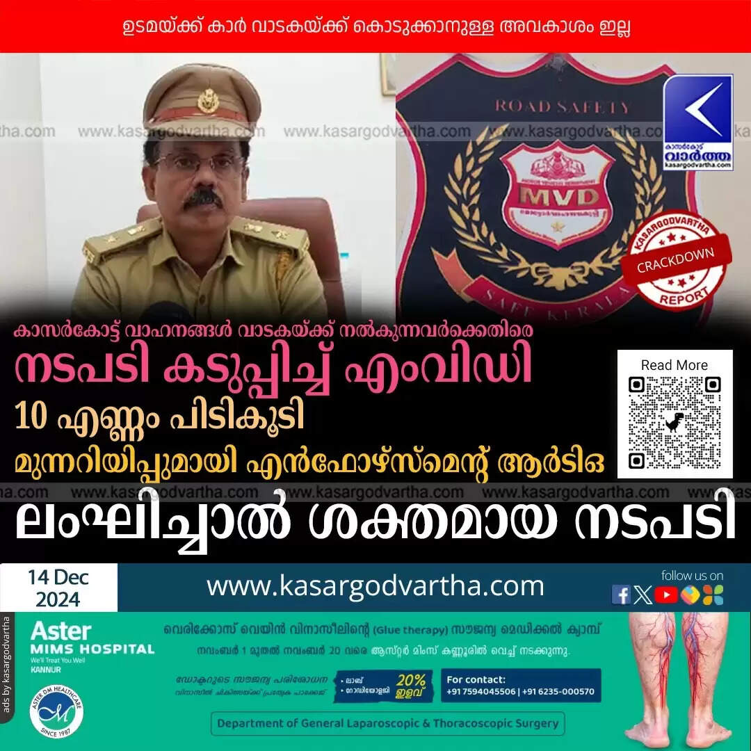Crackdown | കാസര്കോട്ട് വാഹനങ്ങള് വാടകയ്ക്ക് നല്കുന്നവര്ക്കെതിരെ നടപടി കടുപ്പിച്ച് എംവിഡി; 10 എണ്ണം പിടികൂടി; മുന്നറിയിപ്പുമായി എന്ഫോഴ്സ്മെന്റ് ആര്ടിഒ; ലംഘിച്ചാല് ശക്തമായ നടപടി