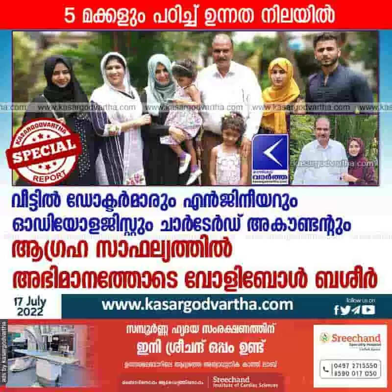 Keywords: News, Kerala, Kasaragod, Top-Headlines, Education, Doctors, Job, Business-man, Business, Thalangara, Ambition, Volleyball Bashir, All 5 children are educated; Volleyball Bashir with pride in fulfilling his ambition. < !- START disable copy paste -->
