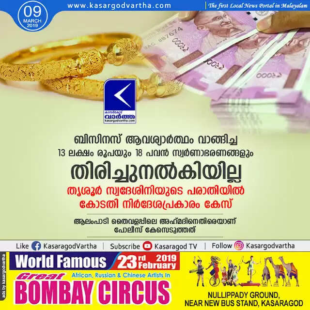 കാസര്കോട്: (www.kasargodvartha.com 09.03.2019) ബിസിനസ് ആവശ്യാര്ത്ഥം വാങ്ങിച്ച 13 ലക്ഷം രൂപയും 18 പവന് സ്വര്ണാഭരണങ്ങളും തിരിച്ചുനല്കിയില്ലെന്ന തൃശൂര് സ്വദേശിനിയുടെ പരാതിയില് കോടതി നിര്ദേശപ്രകാരം പോലീസ് കേസെടുത്തു. തൃശൂര് താനശ്ശേരി സ്വദേശിനി മീരയുടെ പരാതിയില് ആലംപാടി തൈവളപ്പിലെ അഹ് മദിനെതിരെയാണ് കാസര്കോട് ടൗണ് പോലീസ് കേസെടുത്തത്.
