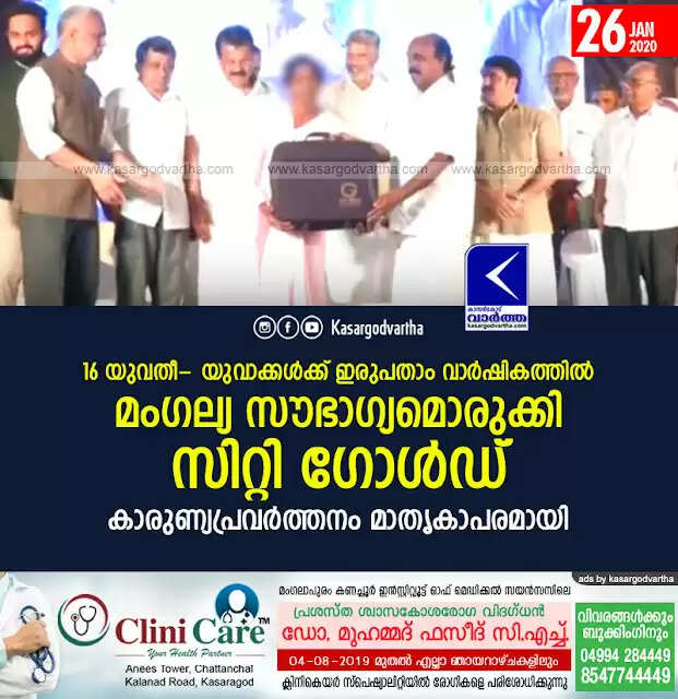 കാസര്കോട്: (www.kasargodvartha.com 26.01.2020) 16 യുവതീ- യുവാക്കള്ക്ക് ഇരുപതാം വാര്ഷികത്തില് മംഗല്യ സൗഭാഗ്യമൊരുക്കി സിറ്റി ഗോള്ഡ്. കാസര്കോട് വിന്ടച്ച് പാമഡോസില് നടന്ന ചടങ്ങില് വന് ജനാവലിയാണ്