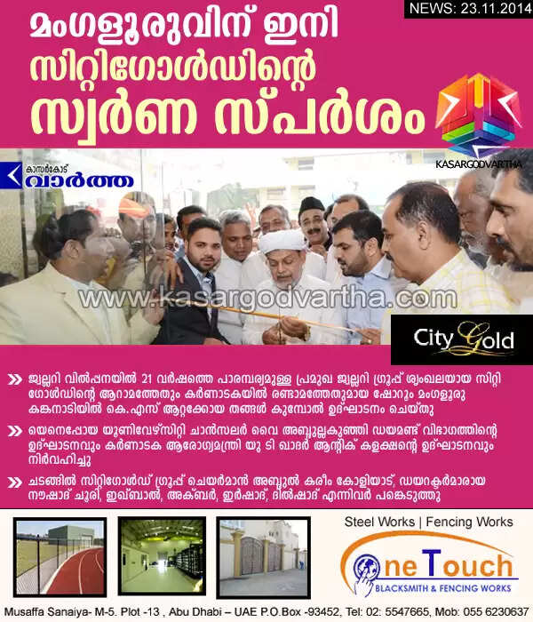 മംഗളൂരു: (www.kasargodvartha.com 23.11.2014) ജ്വല്ലറി വില്പ്പനയില് 21 വര്ഷത്തെ പാരമ്പര്യമുള്ള പ്രമുഖ ജ്വല്ലറി ഗ്രൂപ്പ് ശൃംഖലയായ സിറ്റി ഗോള്ഡിന്റെ ആറാമത്തേതും കര്ണാടകയില് രണ്ടാമത്തേതുമായ ഷോറൂം മംഗളൂരു കങ്കനാടിയില് പ്രവര്ത്തനമാരംഭിച്ചു. കെ എസ് ആറ്റക്കോയ തങ്ങള് കുമ്പോല് ഷോറും ഉദ്ഘാടനവും യെനെപ്പോയ യൂണിവേഴ്സിറ്റി ചാന്സലര് വൈ അബ്ദുല്ലകുഞ്ഞി ഡയമണ്ട് വിഭാഗത്തിന്റെ ഉദ്ഘാടനവും നിര്വഹിച്ചു. കര്ണാടക ആരോഗ്യമന്ത്രി യു ടി ഖാദര് ആന്റിക് കളക്ഷൻ ഉദ്ഘാടനം ചെയ്തു.