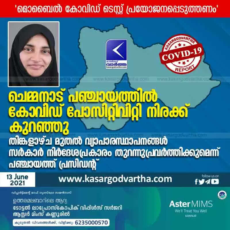 ചെമ്മനാട് പഞ്ചായത്തിൽ കോവിഡ് പോസിറ്റിവിറ്റി നിരക്ക് കുറഞ്ഞു; തിങ്കളാഴ്ച മുതൽ വ്യാപാരസ്ഥാപനങ്ങൾ സർകാർ നിർദേശപ്രകാരം തുറന്നുപ്രവർത്തിക്കുമെന്ന് പഞ്ചായത്ത് പ്രസിഡന്റ്