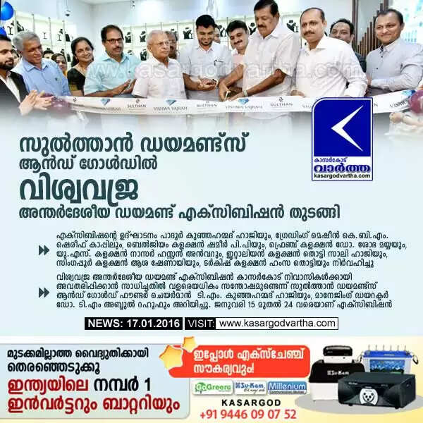 ബംഗളൂരു, മംഗളൂരു, ഷിവമോഗ എന്നിവിടങ്ങളില്‍ വിജയകരമായ വിശ്വവജ്ര അന്തര്‍ദേശീയ ഡയമണ്ട് എക്‌സിബിഷന്‍ കാസര്‍കോട് നിവാസികള്‍ക്കായി അവതരിപ്പിക്കാന്‍ സാധിച്ചതില്‍ വളരെയധികം സന്തോഷമുണ്ടെന്ന് സുല്‍ത്താന്‍ ഡയമണ്ട്‌സ് ആന്‍ഡ് ഗോള്‍ഡ് ഫൗണ്ടര്‍ ചെയര്‍മാന്‍ടി.എം. കുഞ്ഞഹമ്മദ് ഹാജിയും, മാനേജിംഗ് ഡയറക്ടര്‍ ഡോ. ടി.എം അബ്ദുല്‍ റഹൂഫും അറിയിച്ചു. എക്‌സിബിഷന്റെ ഭാഗമായി, ഡയമണ്ട് കാരറ്റ് വിലയില്‍ 5000 രൂപ ഡിസ്‌കൗണ്ട് ലഭ്യമാണെന്ന് എക്‌സിക്യുട്ടീവ് ഡയറക്ടര്‍ ടി.എം അബ്ദുല്‍ റഹീം അറിയിച്ചു.
