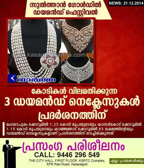 കാസര്‍കോട്: (www.kasargodvartha.com 21.12.2014) സുല്‍ത്താന്‍ ഗോള്‍ഡ് ഇന്റര്‍ നാഷണില്‍ നടന്നുവരുന്ന ഡയമന്‍ഡ് ഫെസ്റ്റിവലില്‍ ഒന്നേക്കാല്‍ കോടിയുടെ മൂന്ന് ഡയമന്‍ഡ് നെക്ലേസുകള്‍ പ്രദര്‍ശനത്തിന് വെച്ചു. മംഗലാപുരം ഷോറൂമില്‍ 1.25 കോടി രൂപയുടേയും കാസര്‍കോട് ഷോറൂമില്‍ 1.15 കോടി രൂപയുടേയും കാഞ്ഞങ്ങാട് ഷോറൂമില്‍ 85 ലക്ഷത്തിന്റേയും ഡയമന്‍ഡ് നെക്ലേസുകളാണ് പ്രദര്‍ശനത്തിന് വെച്ചിരിക്കുന്നത്.