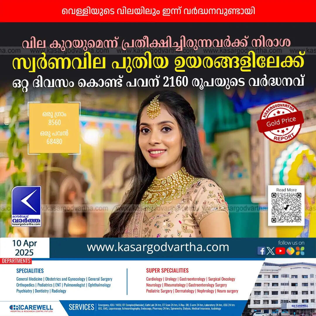 Gold prices in Kerala witnessed an unexpected surge on Thursday, with a significant increase of ₹2160 per sovereign in a single day, reaching ₹68480. The price of one gram of 22-carat gold is now ₹8560. The hike is attributed to increased demand due to changes in import tariffs and the trade tensions between the US and China. Silver prices also saw an increase.