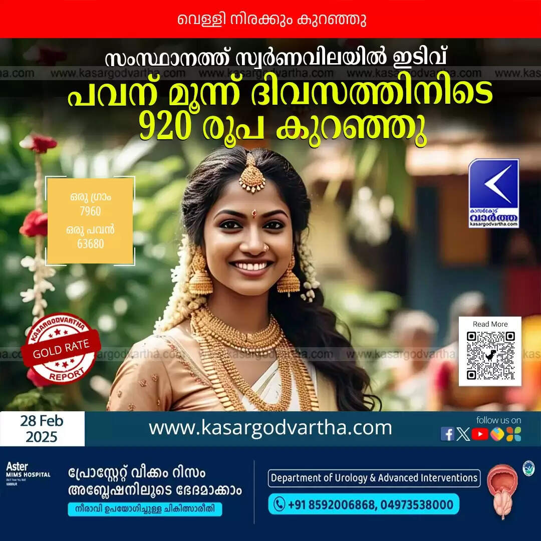 Gold Rate | സംസ്ഥാനത്ത് സ്വര്ണവിലയില് ഇടിവ്; പവന് മൂന്ന് ദിവസത്തിനിടെ 920 രൂപ കുറഞ്ഞു