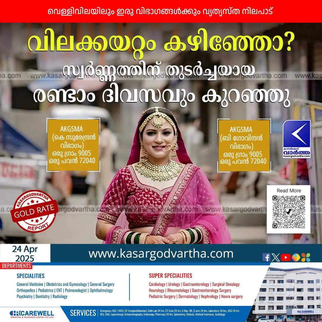 അതേസമയം, ഡോ. ബി ഗോവിന്ദൻ ചെയർമാനും ജസ്റ്റിൻ പാലത്ര പ്രസിഡന്റുമായുള്ള (AKGSMA) വിഭാഗം 18 കാരറ്റ് സ്വർണ്ണത്തിന്റെ വില ഗ്രാമിന് 5 രൂപയും പവന് 80 രൂപയും കുറച്ച് യഥാക്രമം 7460 രൂപയും 59680 രൂപയുമാക്കി.