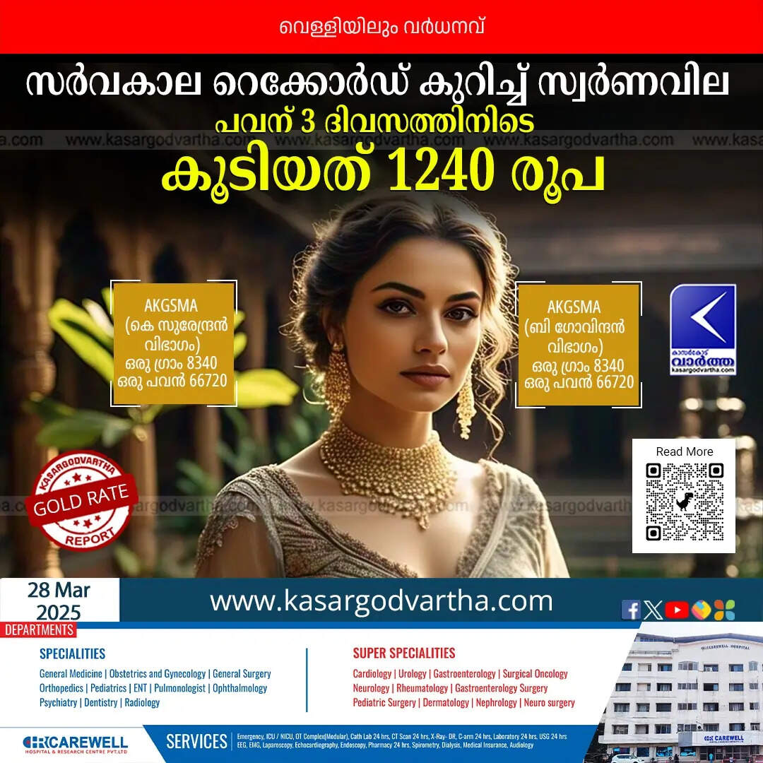 വെള്ളിയാഴ്ച (മാര്ച്ച് 28) 22 കാരറ്റ് സ്വര്ണത്തിന് ഗ്രാമിന് 105 രൂപയുടെ വര്ധനവാണ് രേഖപ്പെടുത്തിയത്. ഇതോടെ ഒരു ഗ്രാം 22 കാരറ്റ് സ്വര്ണത്തിന്റെ വില 8340 രൂപയായി ഉയര്ന്നു. ഒരു പവന് സ്വര്ണ്ണത്തിന്റെ വില 840 രൂപ കൂടി 66720 രൂപയിലെത്തി. മാര്ച്ച് 20 ന് 22 കാരറ്റ് സ്വര്ണം ഗ്രാമിന് 8310 രൂപയും പവന് 66480 രൂപയുമായി സര്വകാല റെക്കോര്ഡ് സ്ഥാപിച്ചിരുന്നു.അതിനുശേഷം വിപണിയില് നേരിയ വിലക്കുറവ് അനുഭവപ്പെട്ടിരുന്നുവെങ്കിലും, ബുധനാഴ്ചയും (മാര്ച്ച് 26) വ്യാഴാഴ്ചയും (മാര്ച്ച് 27) സ്വര്ണവില വീണ്ടും ഉയര്ന്നിരുന്നു.