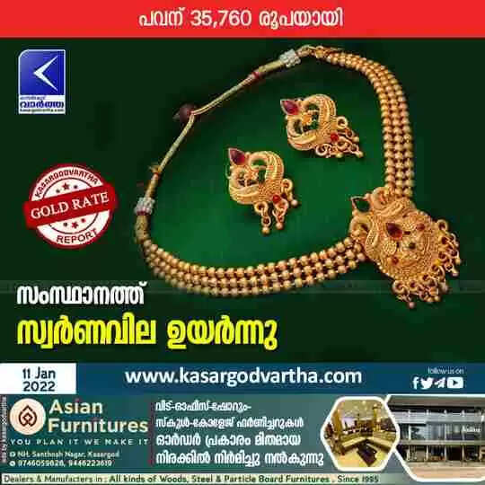 കൊച്ചി: (www.kasargodvartha.com 11.01.2022) സംസ്ഥാനത്ത് ചൊവ്വാഴ്ച സ്വര്‍ണവില ഉയര്‍ന്നു. 160 രൂപ ര്‍ധിച്ച് ഒരു പവന്‍ സ്വര്‍ണത്തിന്റെ വില 35,760 രൂപയായി. ഒരു ഗ്രാം സ്വര്‍ണത്തിന് 20 പ വര്‍ധിച്ചതോടെ ഒരു ഗ്രാമിന് 4470 രൂപയായി.