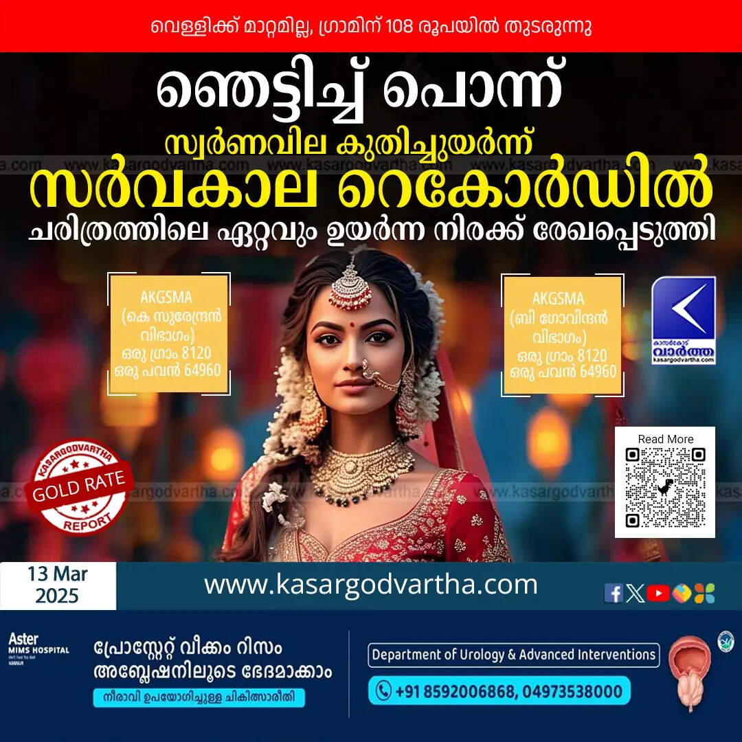 Gold prices in Kerala hit an all-time high, with 22-carat gold reaching a record price. There's a price disparity in 18-carat gold among trader associations. Silver prices remain unchanged.