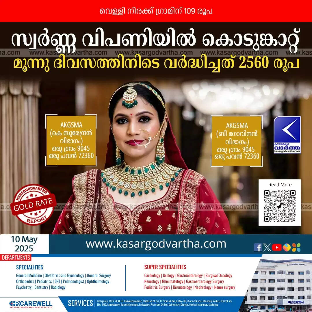 Summary: Gold prices in Kerala continue to rise, with another increase recorded on Saturday, May 10. The price of 22-carat gold reached ₹72,360 per sovereign. Experts are analyzing the reasons behind this surge.