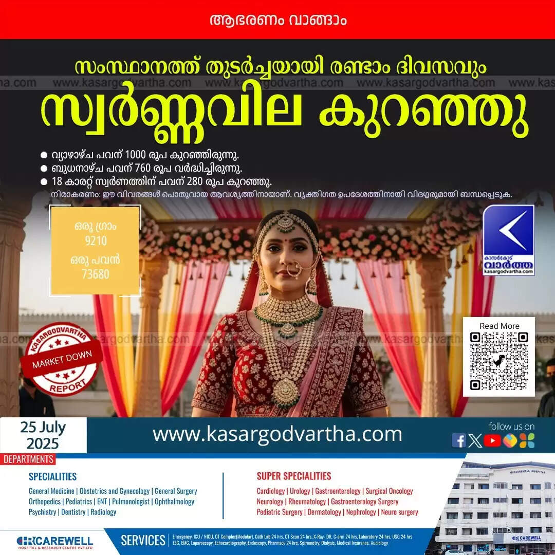 വ്യാഴാഴ്ച (ജൂലൈ 24, 2025) 22 കാരറ്റ് സ്വർണ്ണത്തിന് ഗ്രാമിന് 125 രൂപയും പവന് 1000 രൂപയും കുറഞ്ഞ് 9255 രൂപയിലും 74040 രൂപയിലുമായിരുന്നു വില.