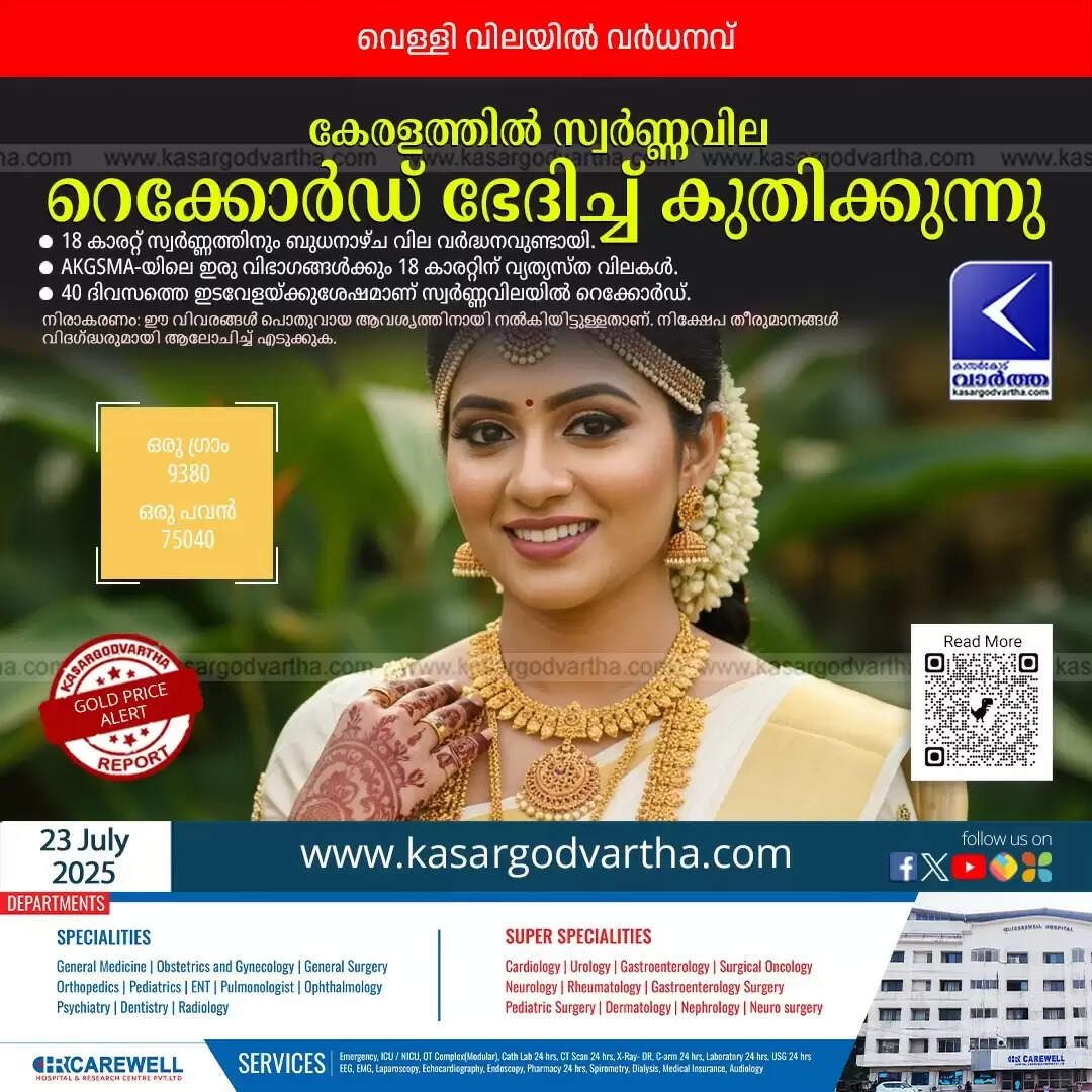 കൊച്ചി: (KasargodVartha) കേരളത്തിൽ സ്വർണ, വെള്ളി വിലകൾ റെക്കോർഡ് ഭേദിച്ച് കുതിക്കുകയാണ്. ജൂലൈ 23, ബുധനാഴ്ചയും സ്വർണവിലയിൽ വലിയ വർദ്ധനവ് രേഖപ്പെടുത്തി. 22 കാരറ്റ് സ്വർണത്തിന് ഗ്രാമിന് 95 രൂപയും പവന് 760 രൂപയും വർധിച്ച് യഥാക്രമം 9380 രൂപയിലും 75040 രൂപയിലുമെത്തി.