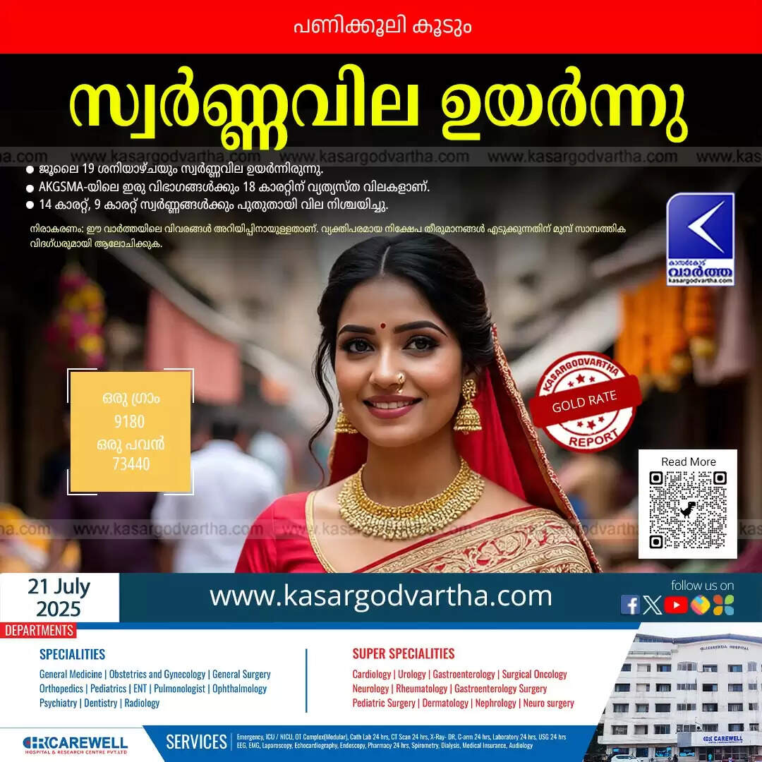 Article Summary: Gold prices rose in Kerala, with 22K gold reaching ₹73,440 per sovereign.