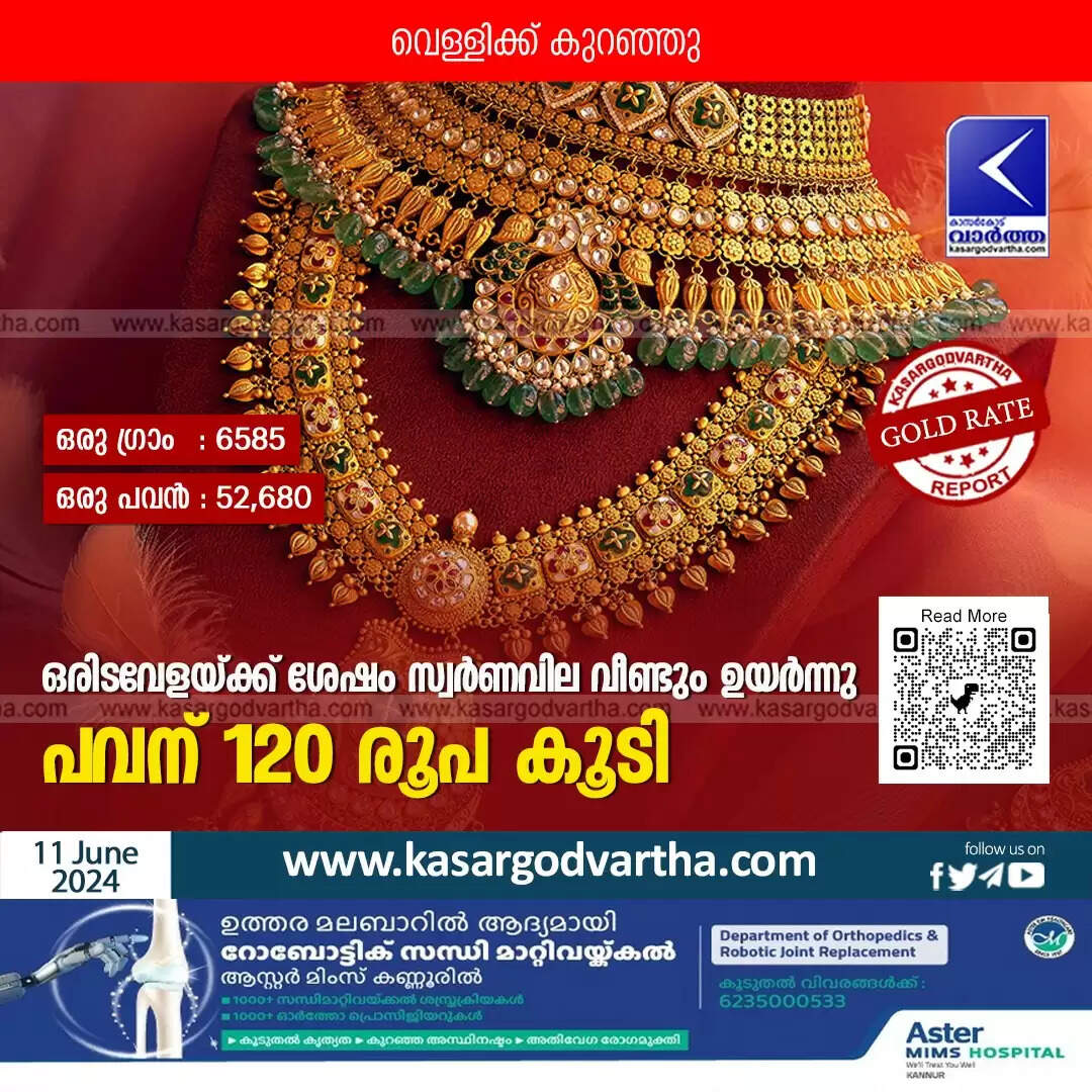 കൊച്ചി: (KasargodVartha) ഒരിടവേളയ്ക്ക് ശേഷം സംസ്ഥാനത്ത് സ്വർണവില വീണ്ടും ഉയർന്നു. ചൊവ്വാഴ്ച (11.06.2024) ഒരു ഗ്രാം 22 കാരറ്റ് സ്വര്ണത്തിന് 15 രൂപയും പവന് 120 രൂപയുമാണ് കൂടിയത്. ഒരു ഗ്രാം 22 കാരറ്റ് സ്വര്ണത്തിന് 6585 രൂപയിലും പവന് 52,680 രൂപയിലുമാണ് വ്യാപാരം നടക്കുന്നത്. ഒരു ഗ്രാം 18 കാരറ്റ് സ്വര്ണത്തിന് 10 രൂപയും പവന് 80 രൂപയും കൂടി ഗ്രാമിന് 5480 രൂപയും പവന് 43,840 രൂപയുമാണ് നിരക്ക്. അതേസമയം വെള്ളി വിലയിൽ ഇടിവുണ്ടായി. ഒരു ഗ്രാം സാധാരണ വെള്ളിക്ക് ഒരു രൂപ കുറഞ്ഞ് 95 രൂപയായാണ് താഴ്ന്നത്.