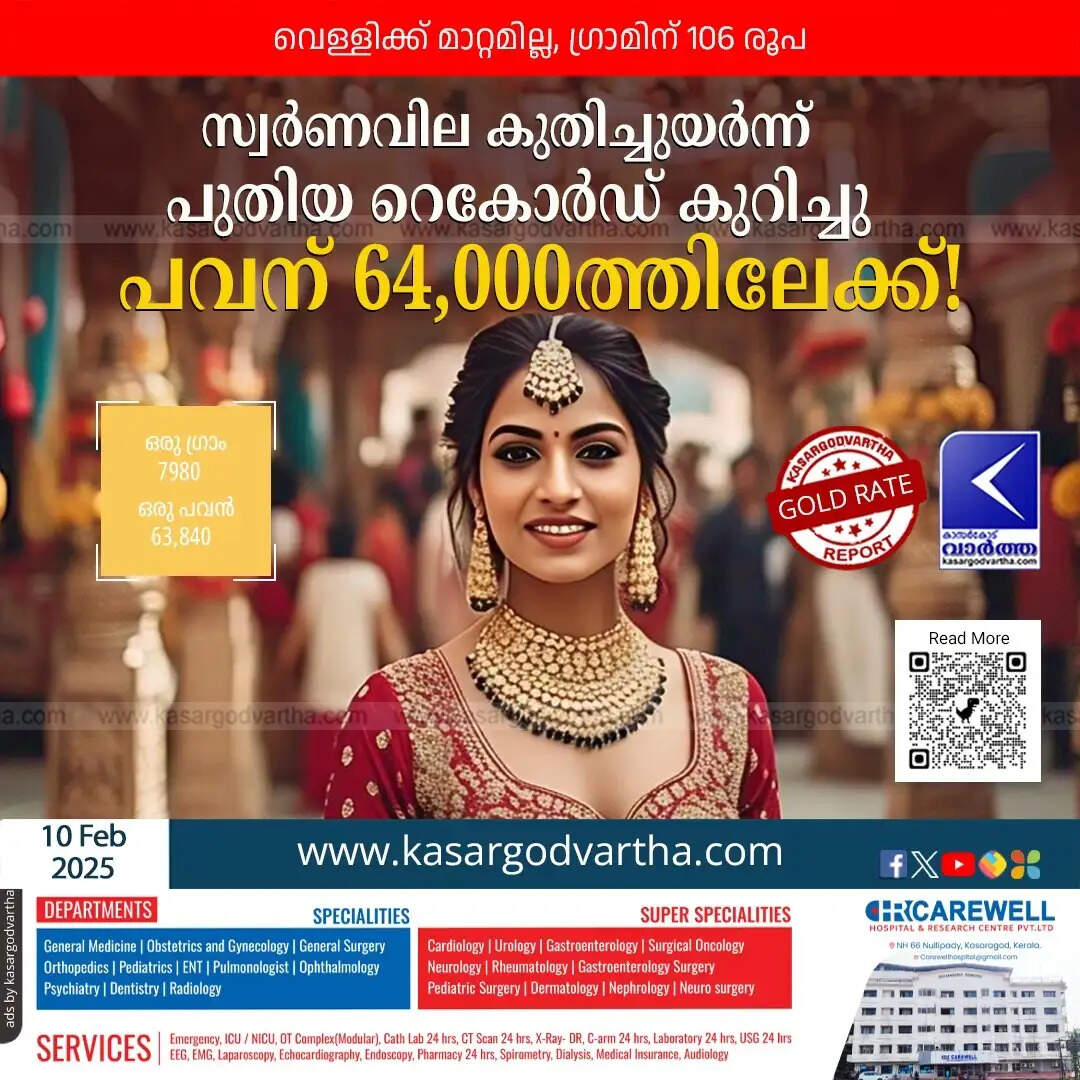 Gold price in Kerala hits a new record high, reaching near ₹64,000 per sovereign. The surge is attributed to fluctuations in dollar and rupee values. 18-carat gold price also increased. Silver price remains stable.