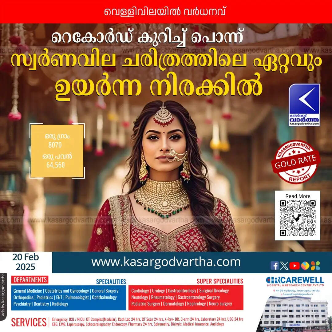 Gold prices reached a historic high on February 20, 2025, with 22-carat gold priced at ₹8070 per gram and ₹64560 per sovereign.