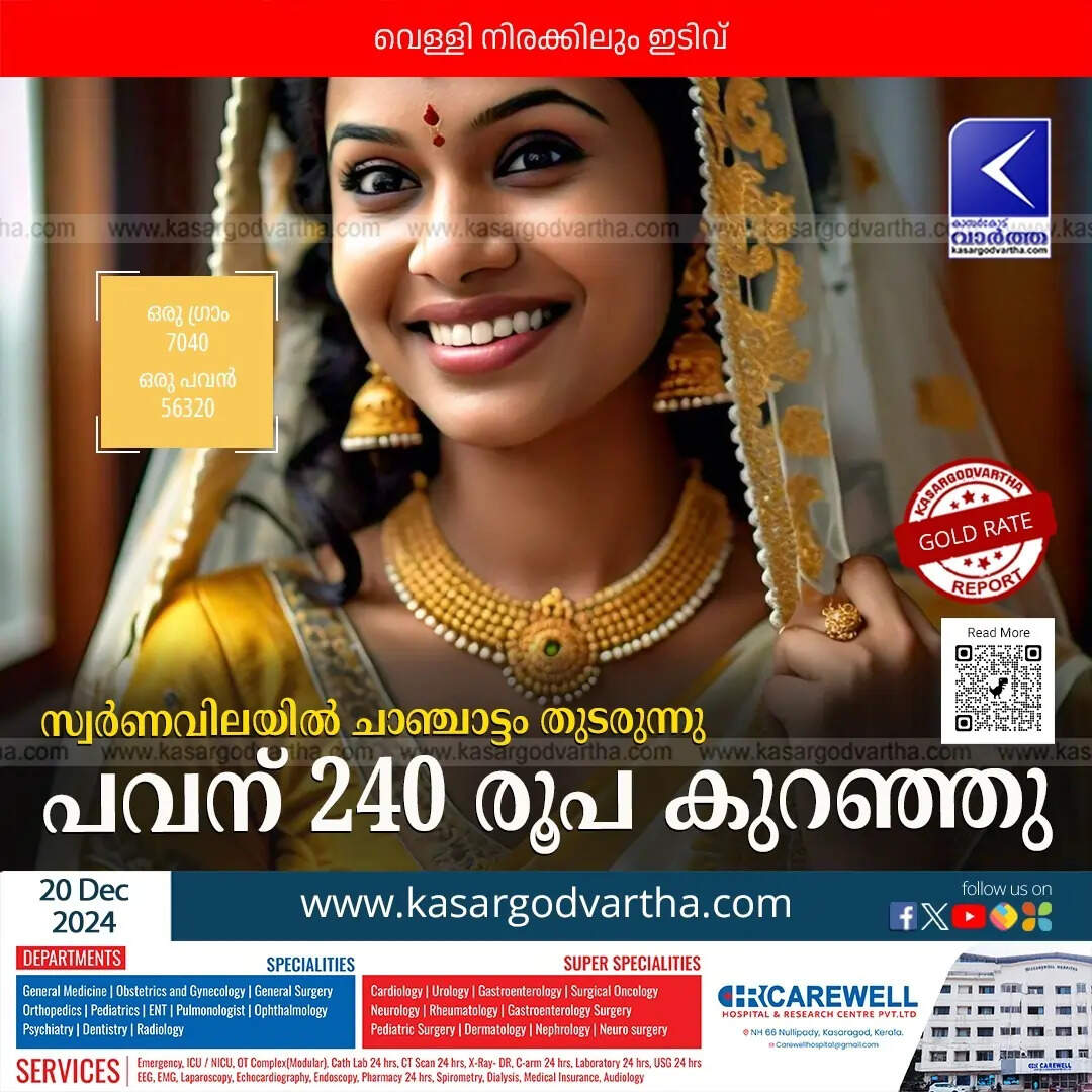 കൊച്ചി: (KasargodVartha) സംസ്ഥാനത്ത് സ്വര്ണവിലയില് ചാഞ്ചാട്ടം തുടരുന്നു. തുടര്ച്ചയായ മൂന്നാം ദിനവും സ്വര്ണവിലയില് ഇടിവ് രേഖപ്പെടുത്തി. വെള്ളിയാഴ്ച (20.12.2024) 22 കാരറ്റ് സ്വര്ണത്തിന് ഗ്രാമിന് 30 രൂപ കുറഞ്ഞ് 7040 രൂപയിലും പവന് 240 രൂപ കുറഞ്ഞ് 56320 രൂപയിലുമാണ് വ്യാപാരം പുരോഗമിക്കുന്നത്.