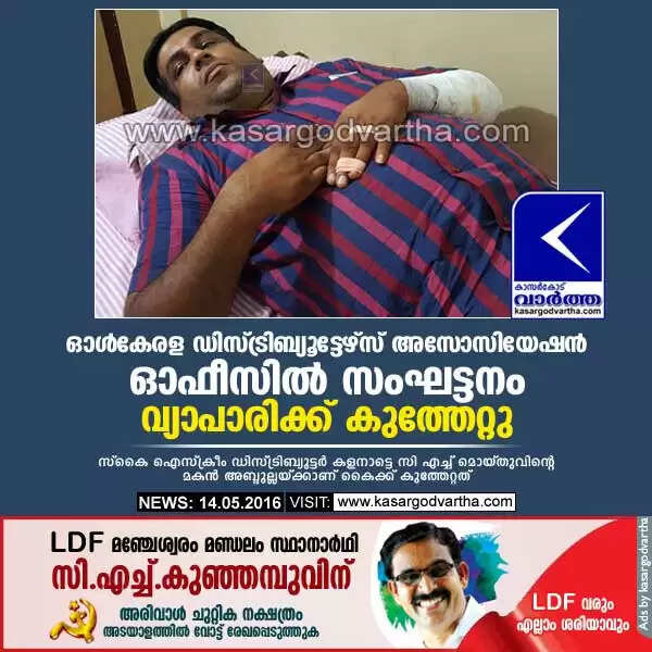 കാസര്‍കോട്: (www.kasargodvartha.com 14.05.2016) ഐസ്‌ക്രീം ഡിസ്ട്രിബ്യൂട്ടര്‍മാര്‍ തമ്മിലുള്ള തര്‍ക്കം പരിഹരിക്കുന്നതിനായി ഓള്‍കേരള ഡിസ്ട്രിബ്യൂട്ടേഴ്‌സ് അസോസിയേഷന്‍ ഓഫീസില്‍ നടന്ന അനുരഞ്ജന ചര്‍ച്ചയ്ക്കിടെയുണ്ടായ സംഘട്ടനത്തില്‍ വ്യാപാരിക്ക് കുത്തേറ്റു.