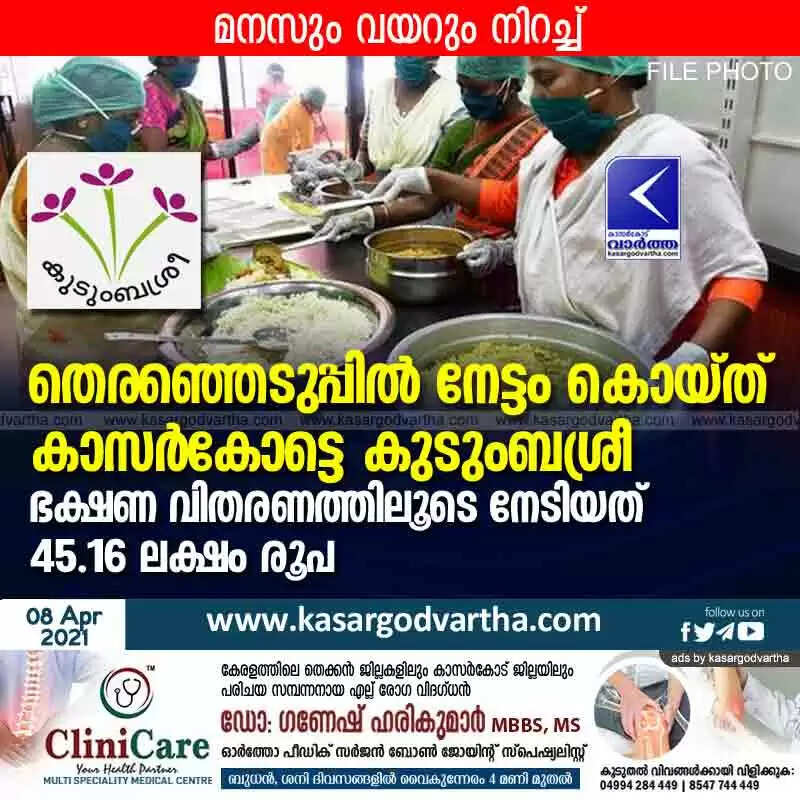 Keywords: Kerala, News, Kasaragod, Kudumbasree, Niyamasabha-Election-2021, Election, Food, Business, Top-Headlines, Kasargode Kudumbasree earned 45.16 lakh through food distribution in election.