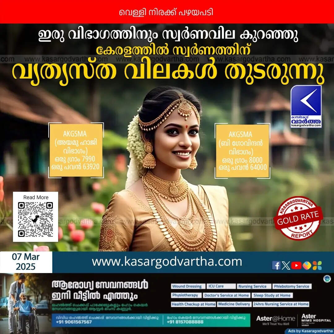 അയമു ഹാജി പ്രസിഡന്റും അഡ്വ. എസ് അബ്ദുല് നാസര് സെക്രടറിയുമായ ഓള് കേരള ഗോള്ഡ് ആന്ഡ് സില്വര് മര്ചന്റസ് അസോസിയേഷന് (AKGSMA) വെള്ളിയാഴ്ച 22 കാരറ്റ് സ്വര്ണത്തിന് ഗ്രാമിന് 60 രൂപയും പവന് 480 രൂപയും കുറച്ചതായി അറിയിച്ചു. ഗ്രാമിന് 8000 രൂപയും പവന് 64,000 രൂപയുമാണ് സംഘടന നിശ്ചയിച്ച വില. 18 കാരറ്റ് സ്വര്ണത്തിന് ഗ്രാമിന് 50 രൂപ കുറച്ച് 6585 രൂപയും പവന് 400 രൂപ കുറച്ച്് 52680 രൂപയുമാണ് നിരക്ക്. സാധാരണ വെള്ളിക്ക് മാറ്റമില്ലാതെ ഗ്രാമിന് 106 രൂപയാണ് നിശ്ചയിച്ചിട്ടുള്ളത്.