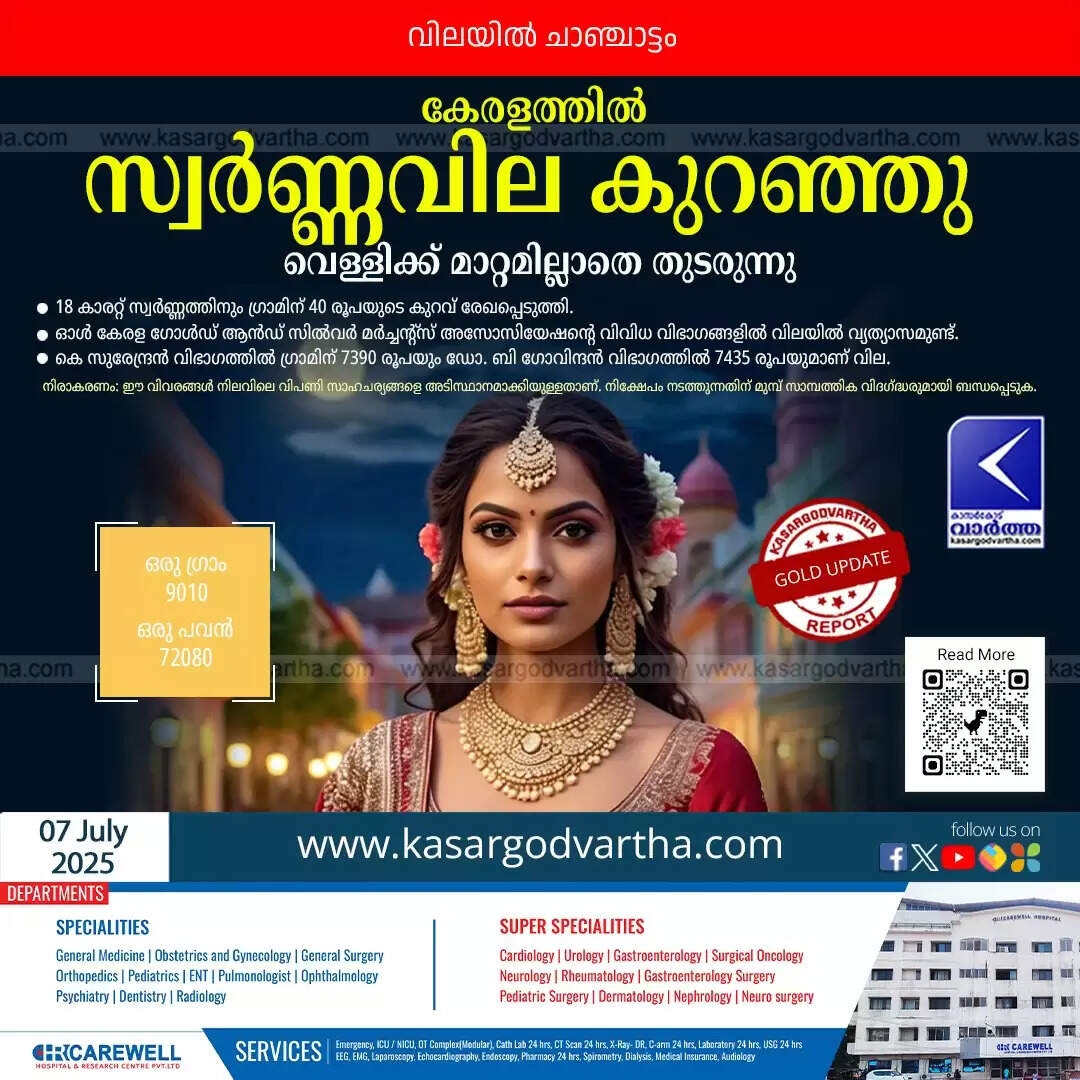 കൊച്ചി: (KasargodVartha) സംസ്ഥാനത്തെ സ്വർണ്ണവിലയിൽ ചാഞ്ചാട്ടം തുടരുകയാണ്. ജൂലൈ ഏഴിന് തിങ്കളാഴ്ച സ്വർണ്ണവിലയിൽ ഗണ്യമായ കുറവ് രേഖപ്പെടുത്തി. തിങ്കളാഴ്ച 22 കാരറ്റ് സ്വർണ്ണത്തിന് ഗ്രാമിന് 50 രൂപ കുറഞ്ഞ് 9010 രൂപയായി. ഒരു പവന് 400 രൂപ കുറഞ്ഞ് 72080 രൂപയിലാണ് വ്യാപാരം നടക്കുന്നത്.