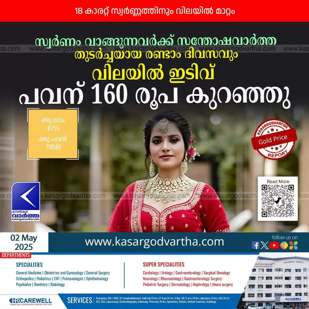 കഴിഞ്ഞ ദിവസം, വ്യാഴാഴ്ച (01.05.2025) 22 കാരറ്റ് സ്വർണ്ണത്തിന് ഗ്രാമിന് 205 രൂപയും പവന് 1640 രൂപയും കുറഞ്ഞിരുന്നു. ബുധനാഴ്ച (30.04.2025) ഗ്രാമിന് 8980 രൂപയും പവന് 71840 രൂപയുമായിരുന്നു 22 കാരറ്റ് സ്വർണ്ണത്തിന്റെ വില.