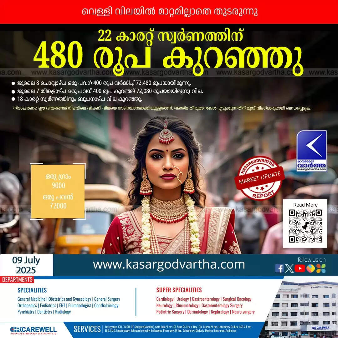 ● ചൊവ്വാഴ്ച (ജൂലൈ 8): സ്വർണവിലയിൽ വർധനവുണ്ടായിരുന്നു. ഒരു ഗ്രാം 22 കാരറ്റ് സ്വർണത്തിന് 50 രൂപ വർധിച്ച് 9,060 രൂപയിലും, ഒരു പവന് 400 രൂപ വർധിച്ച് 72,480 രൂപയിലുമായിരുന്നു വ്യാപാരം നടന്നത്.
