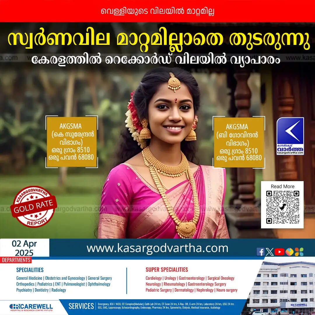 ഏപ്രില് രണ്ടിന് ബുധനാഴ്ച ഒരു ഗ്രാം 22 കാരറ്റ് സ്വര്ണത്തിന്റെ വില 8510 രൂപയിലും ഒരു പവന് സ്വര്ണ്ണത്തിന്റെ വില 68080 രൂപയിലുമാണ്. ചൊവ്വാഴ്ച (ഏപ്രില് 01) 22 കാരറ്റ് സ്വര്ണത്തിന് ഗ്രാമിന് 85 രൂപയും പവന് 680 രൂപയുമായി വര്ധിച്ചിരുന്നു.