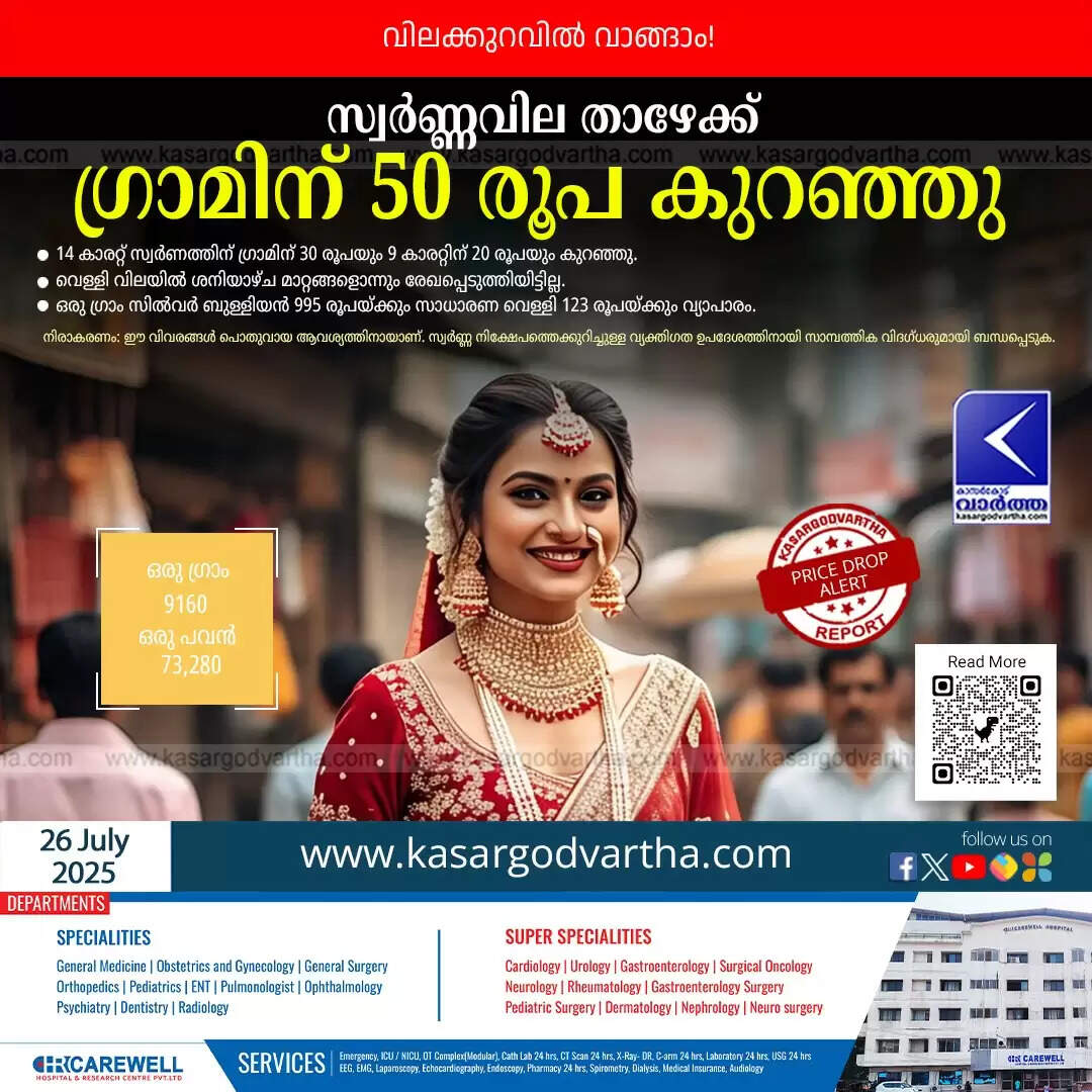 Article Summary: Kerala gold price drops by ₹50 per gram today, reaching ₹73,280 per sovereign.