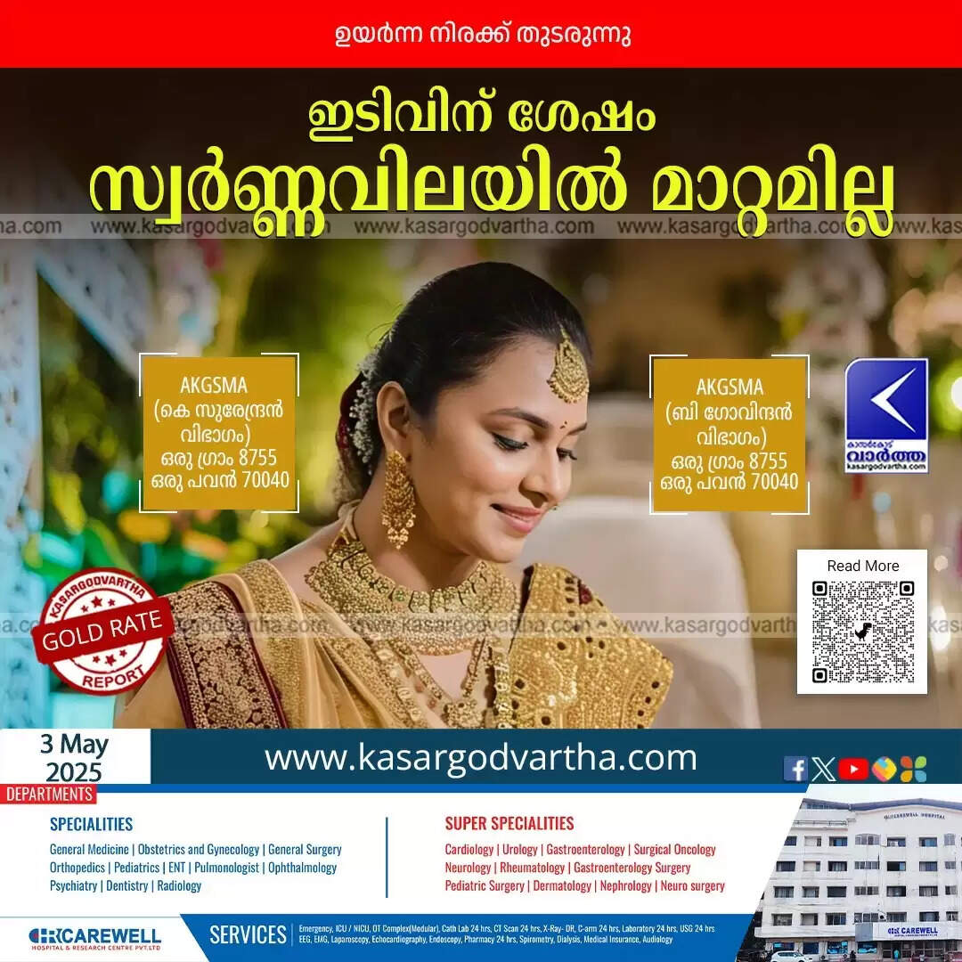 Gold prices in Kerala remained stable on May 3, 2025, with 22-carat gold trading at ₹8755 per gram and ₹70040 per sovereign, after a two-day decline. Prices for 18-carat gold and silver varied across different factions of the All Kerala Gold and Silver Merchants Association (AKGSMA).