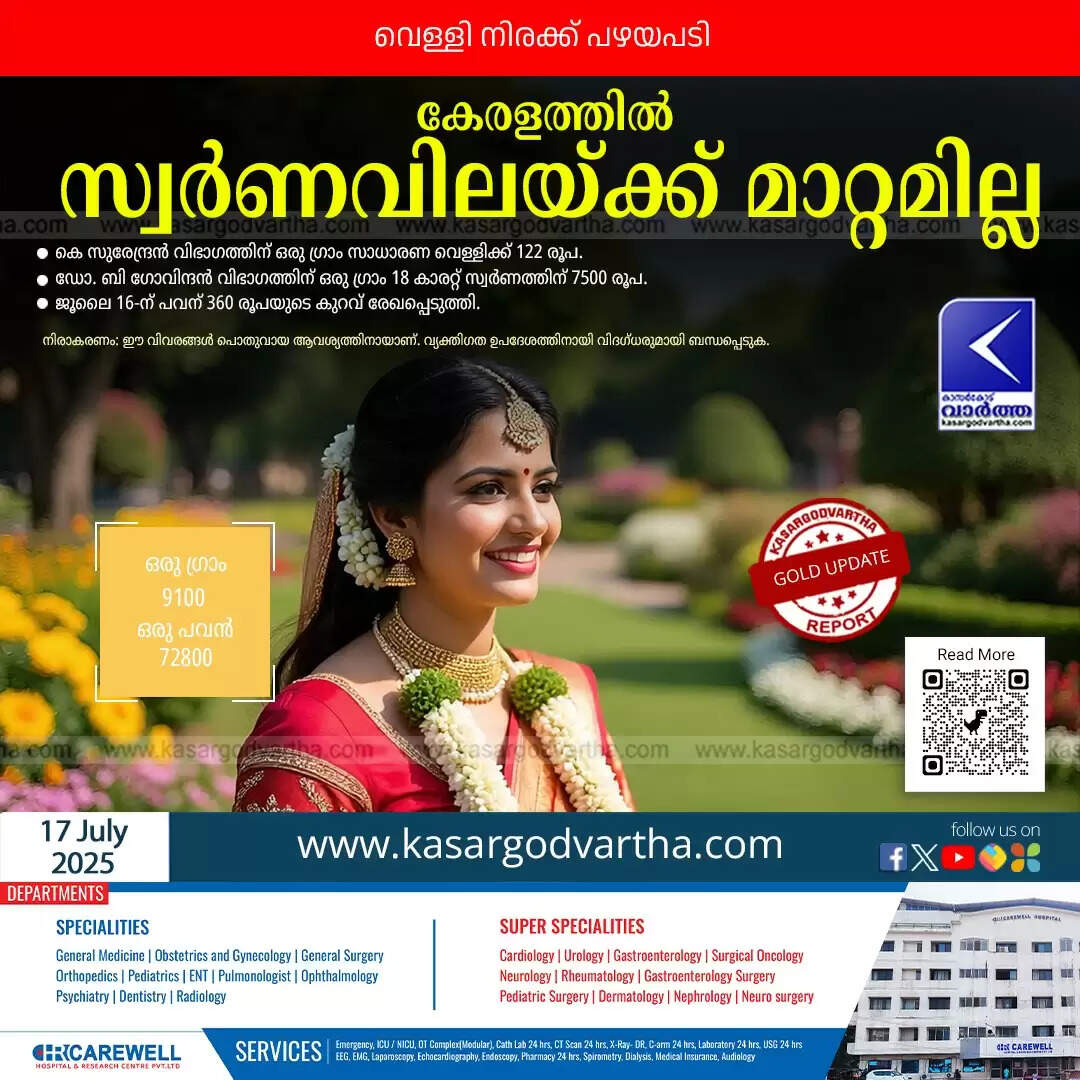 ● ചൊവ്വാഴ്ച (ജൂലൈ 15): 22 കാരറ്റ് സ്വർണത്തിന് ഗ്രാമിന് 10 രൂപ കുറഞ്ഞ് 9145 രൂപയിലും പവന് 80 രൂപ കുറഞ്ഞ് 73,160 രൂപയിലുമായിരുന്നു വ്യാപാരം.