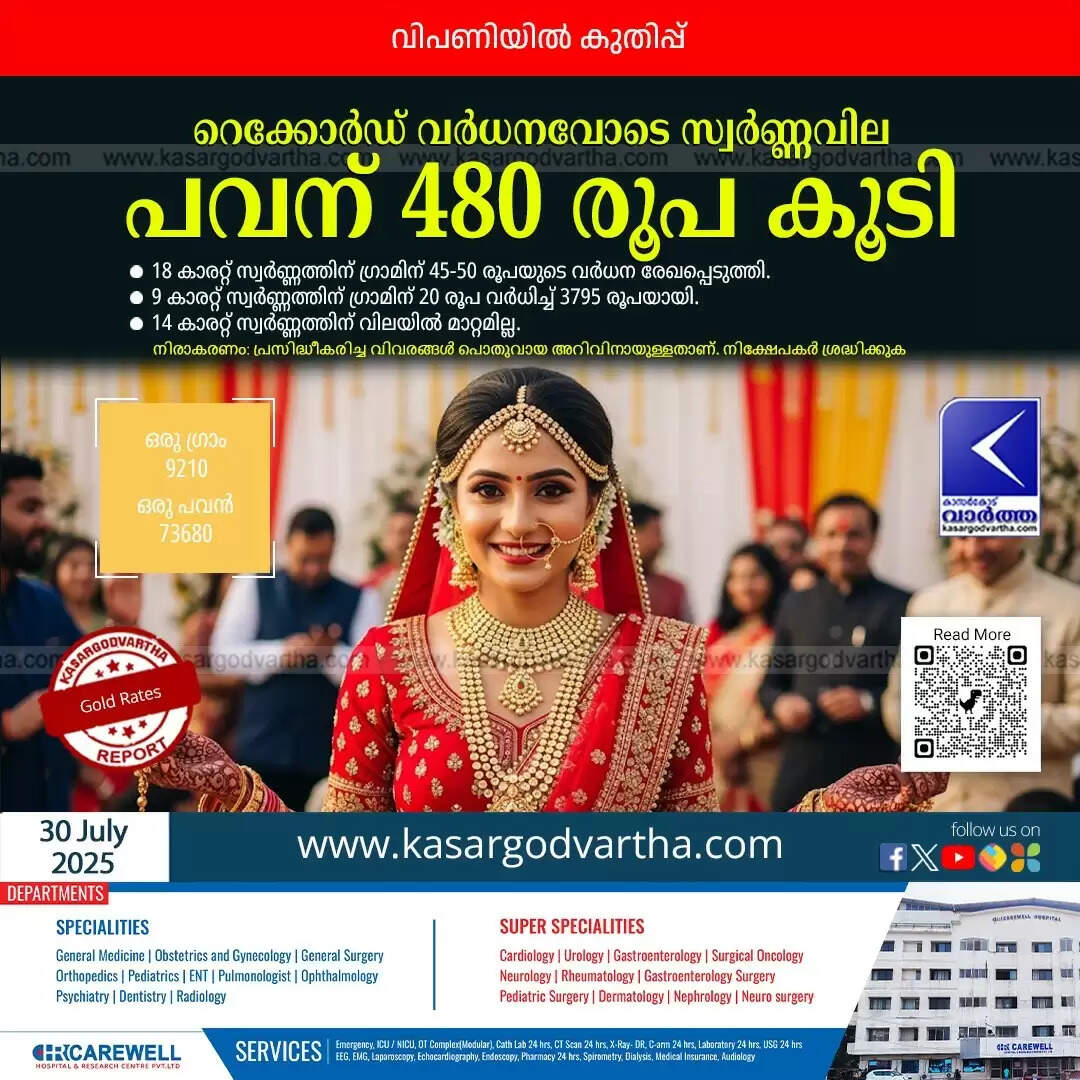 കൊച്ചി: (KasargodVartha) കഴിഞ്ഞ ദിവസങ്ങളിൽ നേരിയ ആശ്വാസം നൽകിയ സ്വർണവില റെക്കോർഡ് വർധനവോടെ കുതിച്ചുയർന്നു. ഒരു പവന് ഒറ്റയടിക്ക് 480 രൂപ വർധിച്ച് 73,680 രൂപയിലെത്തി. ഇതോടെ സ്വർണം വാങ്ങാൻ കാത്തിരുന്നവർക്ക് കനത്ത തിരിച്ചടിയായി. ഈ ജൂലൈ മാസം സ്വർണവിപണിയിൽ വലിയ ചാഞ്ചാട്ടങ്ങളാണ് രേഖപ്പെടുത്തുന്നത്.
